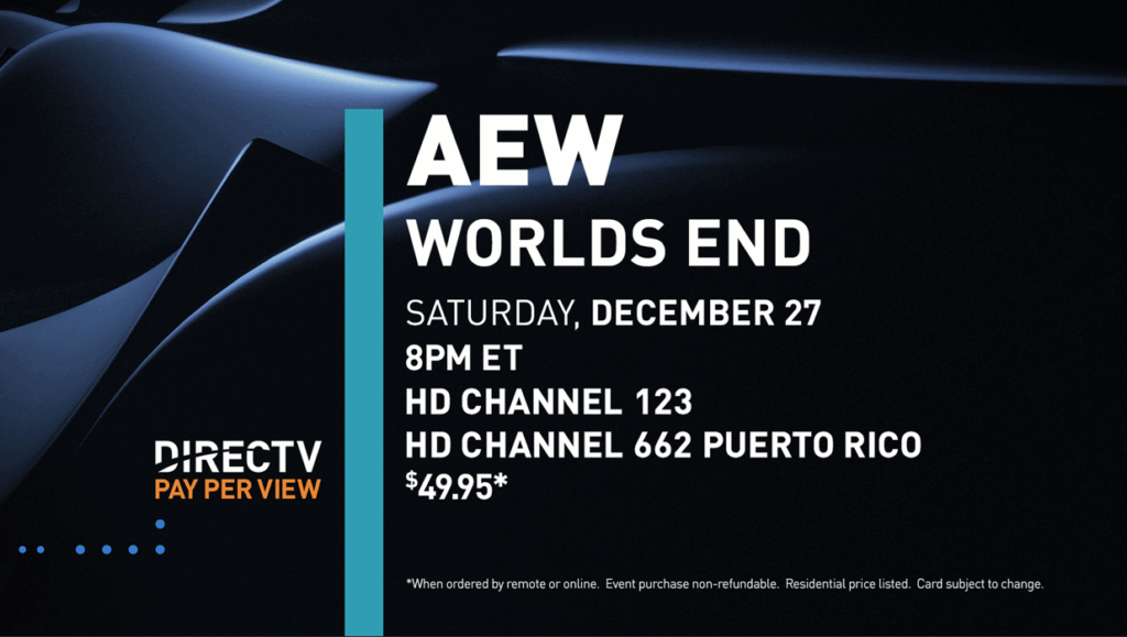Your DIRECTV for BUSINESS channel for AEW: WORLDS END will be available on HD channel 123. You can test your signal any time on Saturday, from 9am ET to 7pm ET. Once activated you should see the DTV Activation slide pictured to the left, if not please call Joe Hand Promotions at 1-800-557-4263.